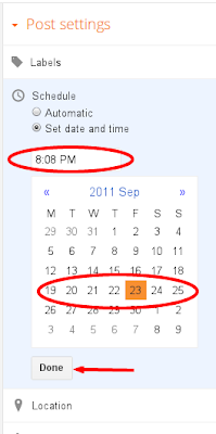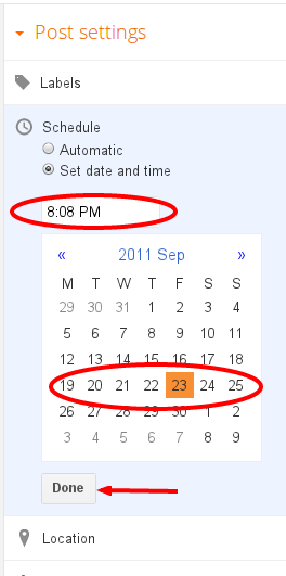 You can click in the time box to schedule the time for your blog to publish at the time of you choice, and also the date and day. After selecting appropriate time frame, just click done tab.
